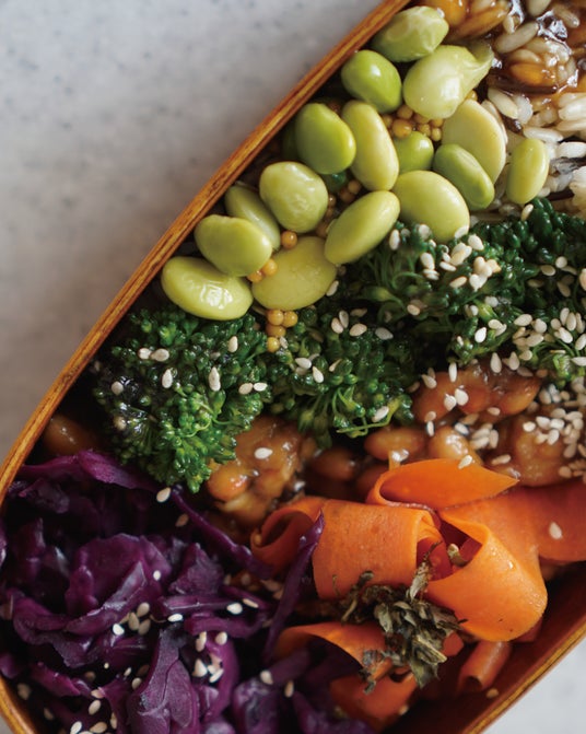 予約販売(数量限定)玄米と黒米に、よもぎを使ったテリヤキテンペとザワークラウトを合わせた発酵バランス弁当。黒にんにくのコクとシードの食感が重なり、植物性でもしっかり満たされる一品。