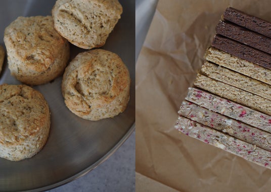 【 写真:左 YOMOGI SCORN (よもぎスコーン) :右 YOMOGI VEGAN PROTEIN BAR (よもぎビーガンプロテインバー) 】