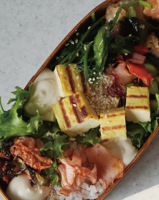 予約販売(数量限定)十五穀米と発酵の力をベースに、塩麹豆腐やマイルドなキムチで整えた一品。よもぎ香る味噌アーモンドソースが奥行きを生み、軽やかで満足感のある発酵弁当。