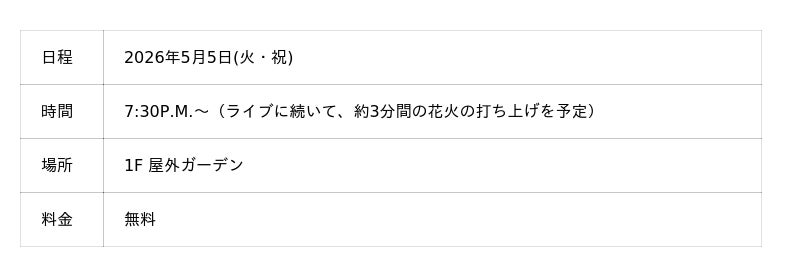 ※屋外ガーデンでの「立ち見」でのご観覧となります。お席のご用意はございませんので、あらかじめご了承ください。