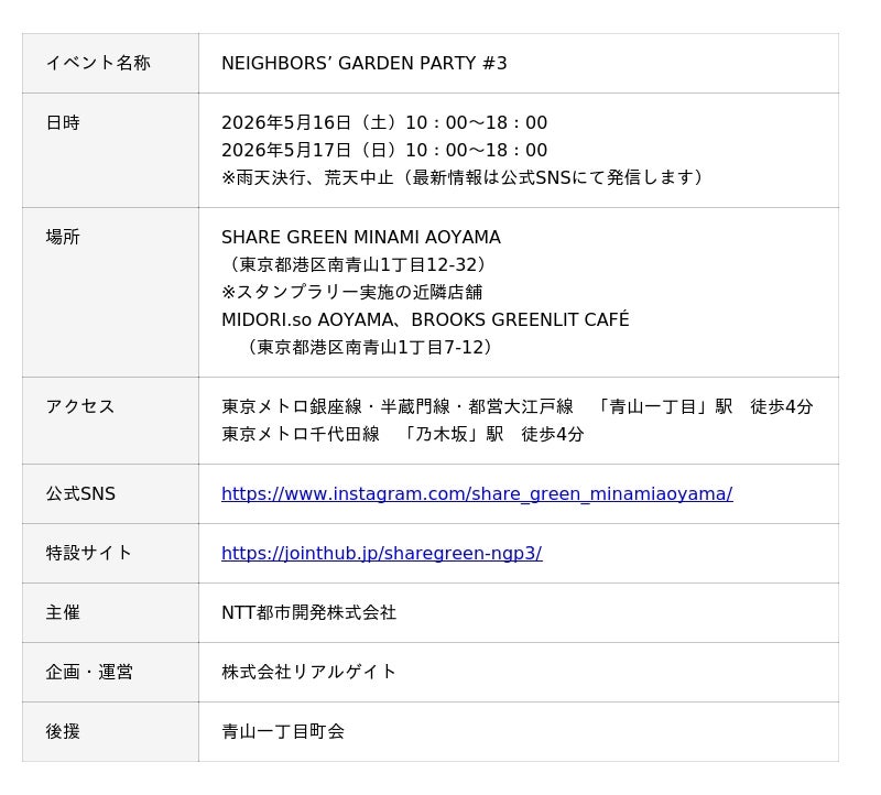 NTT都市開発株式会社(本社:東京都千代田区、代表取締役社長 池田 康)は、「SHARE GREEN MINAMI AOYAMA」(東京都港区南青山1丁目)にて、過去2回で累計約1万5千人を動員したコミュニティイベント「NEIGHBORS’ GARDEN PARTY #3」を5月16日(土)・5月17日(日)の2日間にわたり開催します。