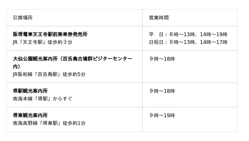 「堺おもてなしチケット(阪堺拡大版)」はご利用日当日、事前に以下の引換場所にて、スマートフォンのチケット画面をご呈示のうえお受け取りください。本チケットの提示により、観光施設等で割引などの特典を受けることができます。