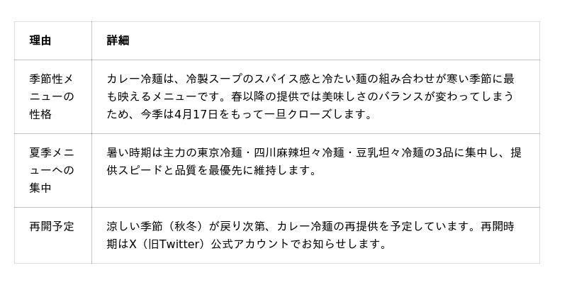 カレー冷麺は秋冬シーズンに再登場予定です。再開情報はX公式アカウント(@tokyoreimen)でお知らせします。