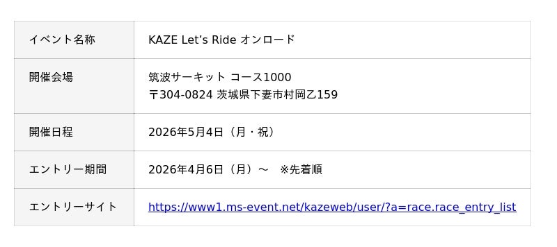 株式会社カワサキモータースジャパン(本社:兵庫県明石市、代表取締役社長:佐伯 健児)は、2026年5月4日(月・祝)に筑波サーキット コース1000にて「KAZE Let’s Ride オンロード」を開催いたします。