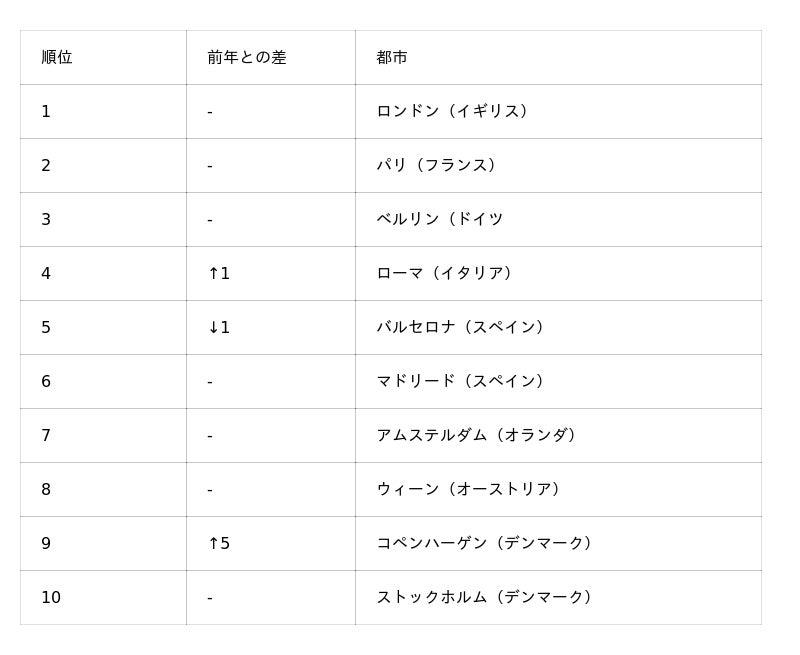 上位陣の顔ぶれは昨年とほぼ同様ですが、ローマ(4位)とバルセロナ(5位)が順位を入れ替えました。また、新たにコペンハーゲンが9位にランクインし、昨年トップ10入りしていたプラハは15位へと後退しました。