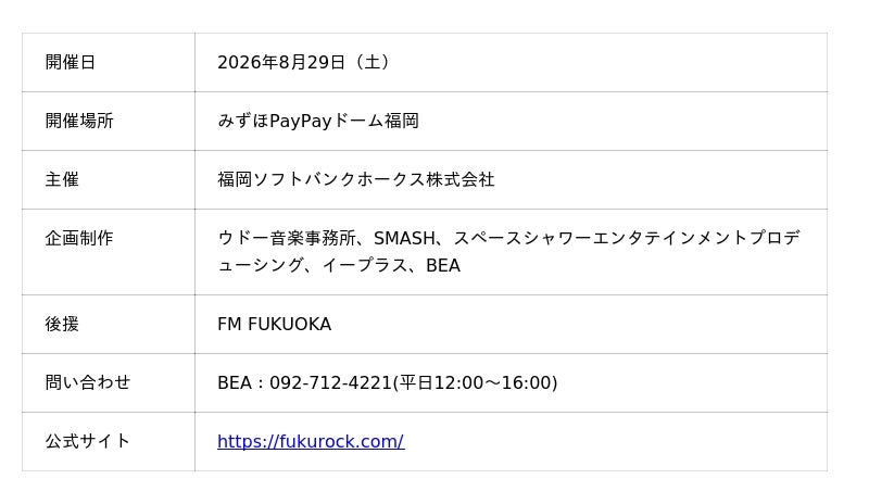 福岡ソフトバンクホークス株式会社(本社:福岡市中央区、代表取締役社長CEO:後藤芳光)は、2026年8月29日(土)、みずほPayPayドーム福岡にて、初開催となる大型音楽ライブイベント「THE GREATEST ROCK FUKUOKA(ザ グレイテスト ロック フクオカ)」を開催します。