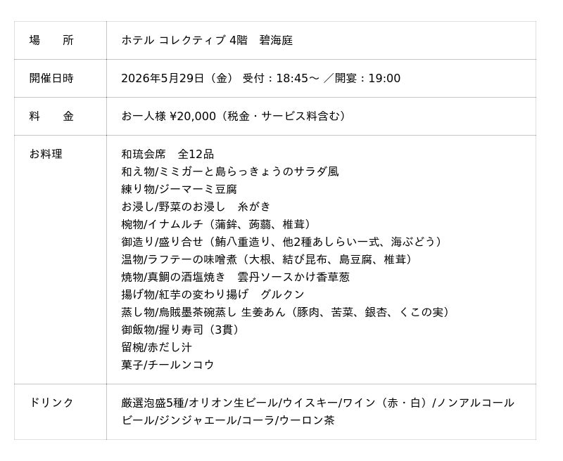 国際通りに位置するホテル コレクティブは、2026年5月29日(金)に、沖縄の伝統料理と琉球伝統芸能を同時に楽しめる特別なイベント「和琉会席×琉球伝統芸能の夕べ」を開催いたします 。ホテルに在籍する「琉球料理伝承人」が腕を振るう品々と、泡盛マイスター厳選の銘酒、そして優美な舞と音色で、心満たされる上質な夜をお届けします 。