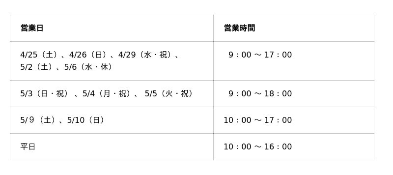 5月2日(土)から5日(火・祝)については、営業時間を拡大するとともに、特別料金にて営業いたします。期間中はチケット窓口の混雑が予想されますので、お得なWEBチケットのご購入がお勧めです。