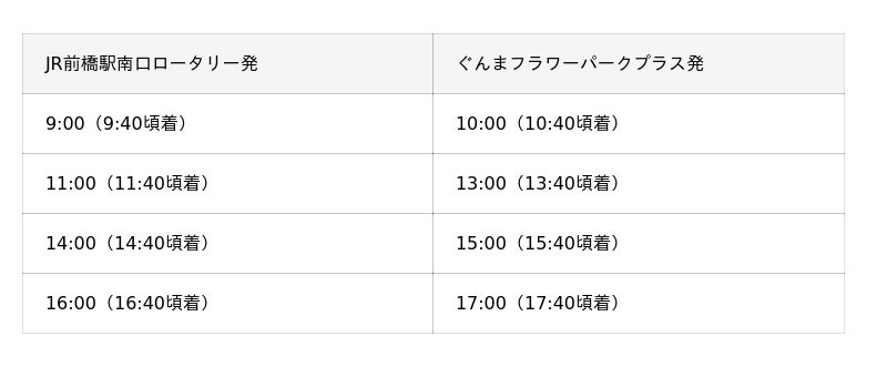JR前橋駅南口ロータリーとぐんまフラワーパークプラスを約40分で結ぶ、予約不要・無料でご利用いただける直行バスです 。