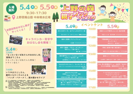 イベントステージでは、絵本作家の林廉恩さんと歌手の一青窈さんによるおはなし会や、大友剛さんによる「絵本と音楽とマジックショー」など多くのイベントを開催予定。