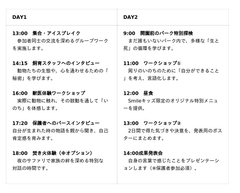 本プログラムは、2022年からスタートし、今年で3回目を迎えます。開園前のパーク探検や、夜のサファリでの焚き火など、非日常の体験から「いのちの尊さ」や「自分が愛されていること」を学び、子どもの自己肯定感や未来をつくる志を育む2日間です。