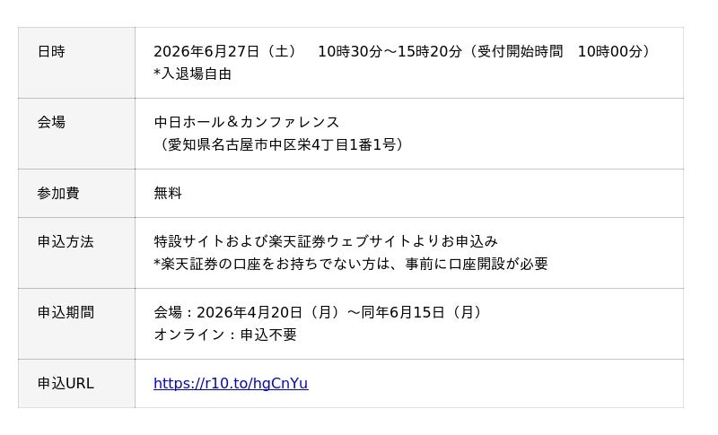 楽天証券株式会社(本社:東京都港区、代表取締役社長:楠 雄治、以下「楽天証券」)は、2026年6月27日(土)の愛知県名古屋市を皮切りに、全国主要5都市で「為替・経済アカデミー」を開催することをお知らせします。本セミナーは、楽天証券のお客様が無料で参加可能な各会場での開催に加え、オンライン配信もおこなうハイブリッド形式で開催します。会場、オンライン配信のいずれも入退場は自由です。また、本日、2026年4月20日(月)より、「為替・経済アカデミー 名古屋」の申込みを開始したことを、あわせてお知らせします。