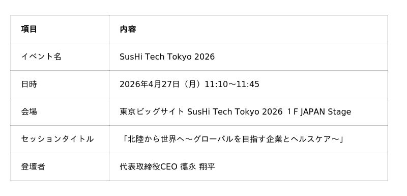 「glucose flight(R)」は、福井県における糖尿病重症化予防事業の実践を通じて独自開発した血糖基盤モデルを中核技術として搭載しており、蓄積された血糖値データ1,000万件超がその精度を支えています。このたびのSusHi Tech Tokyo 2026への参画を通じ、同モデルを軸とした次世代ウェルネス産業の創出に向けた当社の取り組みを国内外に広く発信してまいります。あわせて、健保組合・保健指導代理店・製薬/食品/保険各社との具体的な産業連携に向けた対話を積極的に推進してまいります。