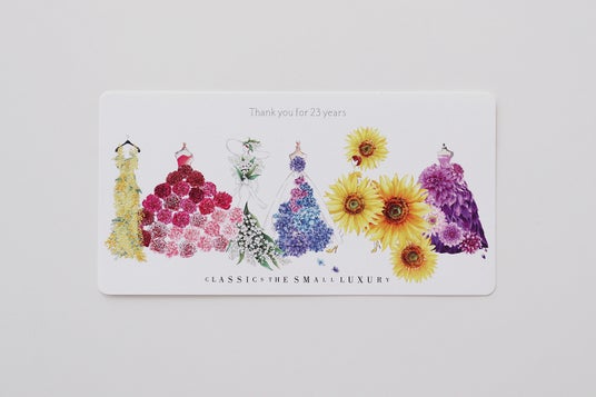 ブランド誕生23周年を記念し、ハンカチーフをご購入のお客様に特典をご用意しております。当ブランドのデザイナーが手がける、花をドレスに見立てたハンカチーフシリーズ「 Dress in Bloom 」より、それぞれの季節を彩るドレスをあしらったオリジナルポストカードをプレゼントいたします。日頃の感謝の気持ちを込めた特別な一枚を、ぜひお楽しみください。
