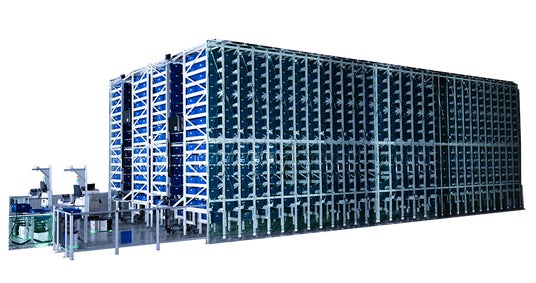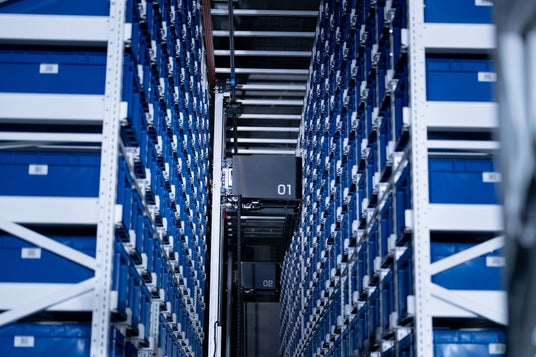 ラックに取り付けたクレーンとAGV(無人搬送車)が連携し、指定のコンテナを作業ステーションへ搬送する自動倉庫です。