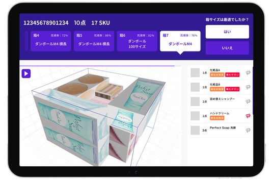 オーダーに合わせて最適な箱サイズを推奨し、商品を「どの向きで、どの順番で」入れるべきかを3Dビジュアルで視覚的に指示。熟練度に頼らない作業の標準化に貢献します。1件5円からの従量課金制で、手軽に導入いただけます。