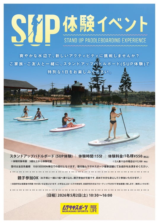 株式会社東京サマーランド(東京都あきる野市、代表取締役社長 武市 敬)は、「遊びでつながる」を デザインするRIDE LIFEの総合プロデュースカンパニー 株式会社ムラサキスポーツ(本社:東京都台東区、取締役社長:金山 洋一)とのコラボレーションを実施します。今回のコラボレーションでは、2026年5月2日(土)限定で、東京サマーランドの屋外プール「ビーバーレイク」にて、ムラサキスポーツ主催の「SUP(スタンドアップパドルボード)体験会」を開催します。また、同日には東京サマーランド内にムラサキスポーツが特別出店いたします。
