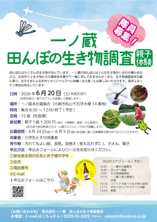 株式会社一ノ蔵(宮城県大崎市松山、代表取締役社長 鈴木 整)は、2026年6月20日(土)に「一ノ蔵 田んぼの生き物調査」のイベントを開催する。