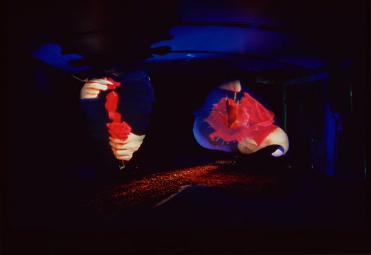 男女を象徴する二つのオブジェに映像を投影。アンスリウムの花の造形は男性性を想起させ、対となる形は女性性を示す。過去の作品でも見られた、花びらを剥ぎピンで留める反復や、降り落ちる紅い花びらが心の葛藤や矛盾、身体性を象徴している。サウンドは現代音楽家・高橋鮎生が担当。