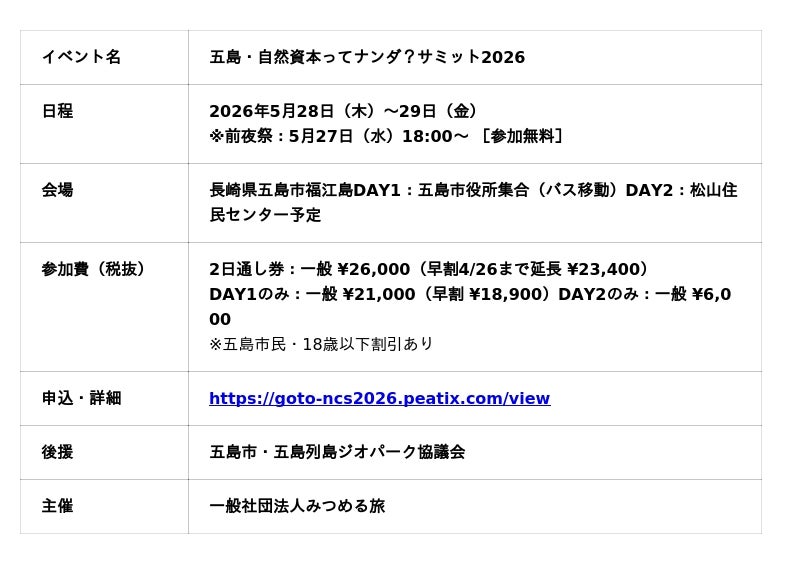 一般社団法人みつめる旅(長崎県五島市武家屋敷、代表理事 遠藤貴恵、以下 みつめる旅)は、長崎県五島市 福江島にて、自然資本と地域・社会・経済との繋がりを体感するイベント「五島・自然資本ってナンダ?サミット2026」を2026年5月28日(木)~29日(金)の2日間、開催いたします。