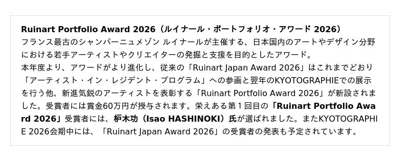 KYOTOGRAPHIEにおいても、2016年より協賛を開始し、2021年には国内の若手アーティストの発掘と支援を目的としたアワード「Ruinart Japan Award(ルイナール・ジャパン・アワード)」を創設。本アワードでは、受賞者はフランス・ランスにあるルイナールのメゾンに招かれ、「アーティスト・イン・レジデンス・プログラム」を通じて、シャンパーニュ造りの現場や自然との関わりを体験しながら滞在制作を行い、翌年のKYOTOGRAPHIEのメインプログラムとして新たな作品を発表します。