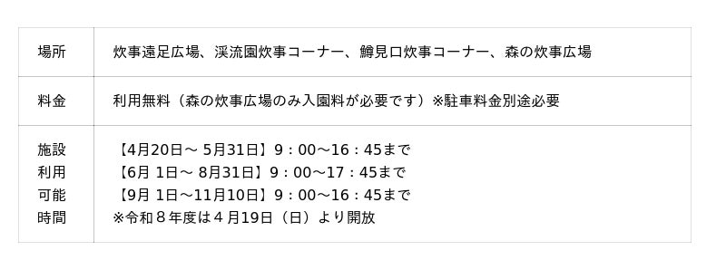 広い園内にある4か所の炊事場やキャンプ場では、BBQをお楽しみいただけます。
