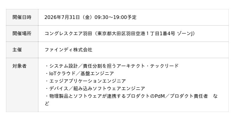 エンジニアプラットフォームを提供するファインディ株式会社(東京都品川区、代表取締役:山田 裕一朗、以下「当社」)は、2026年7月31日(金)にソフトウェアエンジニア向け技術カンファレンス「ソフトウェアデザイン for ハードウェアConference」を開催します。