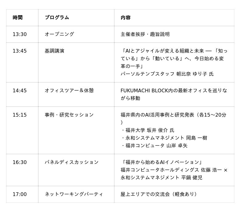 本サミットでは、アジャイル開発をリードする永和システムマネジメントと測量・土木・建築CADのパイオニアである福井コンピュータグループ、そして最新研究を担う福井大学がタッグを組み、綺麗な成功事例だけでなく、試行錯誤の中で得られた「失敗の知見」までをオープンに共有します。福井のAIリテラシーを底上げし、組織の垣根を越えた新たなビジネスの繋がりを生み出すことを目的としています。