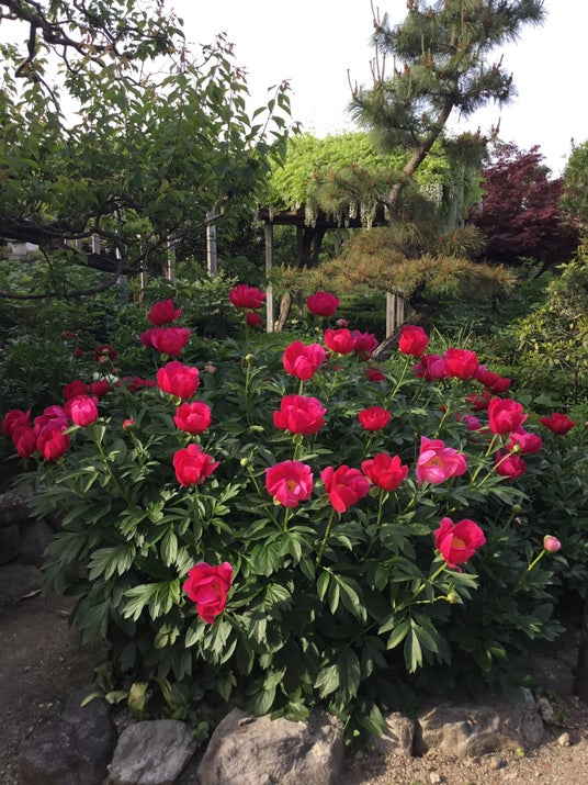 寺院境内で大切に育まれ、癒しの花園となりました。緑一面の中で咲く多種多様なシャクヤクの魅力に触れてみてください。