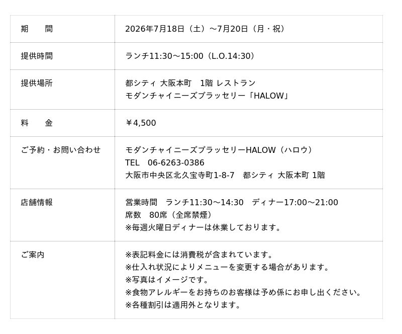 都シティ 大阪本町(所在地:大阪市中央区北久宝寺町1-8-7)は、2026年7月18日(土)から7月20日(月・祝)までの3日間限定で、館内レストラン モダンチャイニーズブラッセリー「HALOW」(ハロウ)にてチャイナスイーツをテーマにしたデザートブッフェ付きランチを提供します。