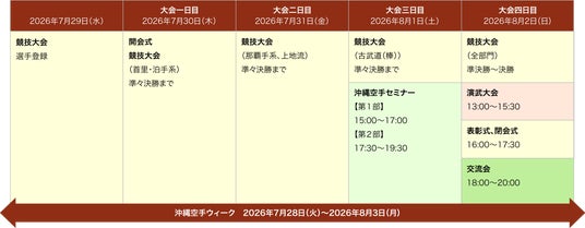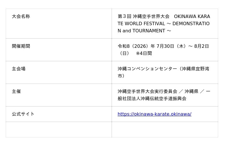 ・大会期間を含む一週間を「沖縄空手ウィーク」とし、沖縄空手会館においても展示資料室の無料開放や空手関連イベント(空手体験教室や沖縄空手ゆかりの地巡りツアー等)を開催します。(詳細は大会ホームページをご確認ください)