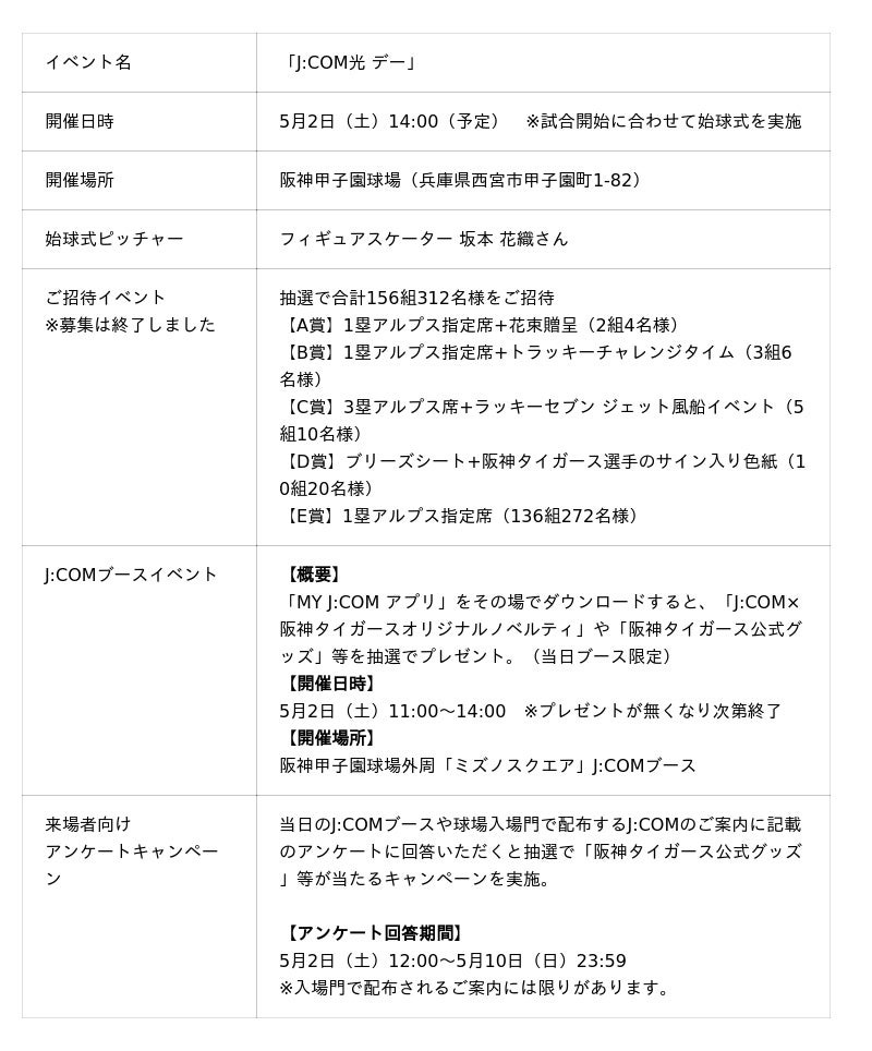 阪神タイガースのシルバーパートナーであるJCOM株式会社(J:COM、本社:東京都千代田区、代表取締役社長:岩木 陽一)は、2026年5月2日(土)に阪神甲子園球場(兵庫県西宮市)で開催される「阪神タイガース 対 読売ジャイアンツ」戦に冠協賛し、「J:COM光 デー」を開催します。