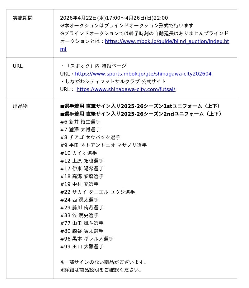【しながわシティフットサルクラブ 2025-26 SEASON UNIFORM AUCTION 概要】