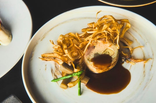 アウトドア料理の定番であるビア缶チキンの発想を取り入れ、しっかりと焼き上げた鶏肉にフォアグラのコクを重ねた、コースの主役にふさわしい一皿に仕上げました。
