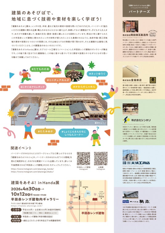 2026年4月30日(木)から10月12日(月・祝)まで、愛知県半田市半田赤レンガ建物ギャラリーにて、レンガや瓦、木材、畳など地元の素材や技術を用いた「あそびば」を、パートナーズ(協力いただける建築に関わる企業・職人のみなさん)とともに創り上げ、体感してもらう展覧会「建築をあそぶ!」展を開催します。この展覧会は、子どもから大人まで、あそびや体験を通して、地域の文化・歴史・技術に親しむことを目的としています。明治31年に建てられた半田赤レンガ建物に使われたレンガの材料が採られたことにも象徴されるように、知多半島・西三河地域の素材や技術ひとつひとつの背景には、その土地ならではの特徴が見て取れます。そんな建築の土着性に気づいていただくことも、この展覧会のねらいのひとつです。