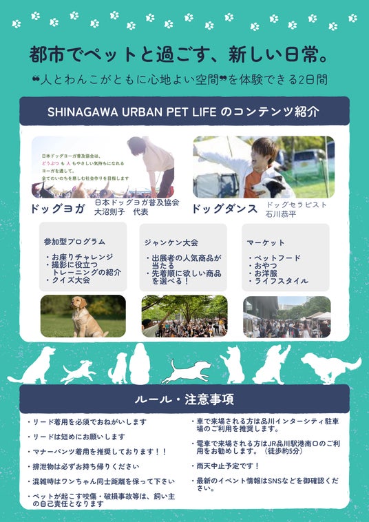 SHINAGAWA URBAN PET LIFEは、都心の複合施設において、ペットと人が心地よく過ごせる都市のあり方を提案する取り組みでもあります。来場者にとっては、愛犬とともに参加し、学び、楽しみ、交流できる場であり、主催・関係者にとっては、都市とペットの新しい関係性を育てていく実践の場でもあります。また、スポンサー企業や出展事業者にとっては、都心生活者とのリアルな接点を持ち、商品やサービスの認知、体験機会、共感形成につなげられる点も大きな魅力です。今後も、品川エリアから都市型ペットライフの可能性を発信し、参加する人にとっても、関わる企業・事業者にとっても価値ある場へと育てていきます。