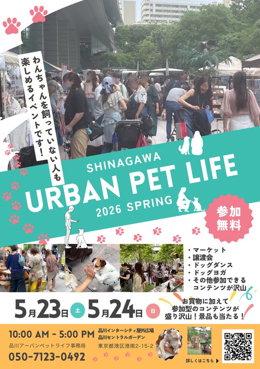 日鉄興和不動産株式会社が主催し、株式会社CarLifeJapanが企画・運営を担う都市型ペットイベント「SHINAGAWA URBAN PET LIFE 2026 SPRING」が、2026年5月23日(土)・24日(日)の2日間、品川インターシティ屋外広場・品川セントラルガーデンにて開催されます。開催時間は両日とも 10:00~17:00、参加は無料です。会場では、マーケット、譲渡会、ドッグダンス、ドッグヨガなどを予定しており、愛犬と飼い主がともに楽しみながら、都心での新しいペットライフに触れられる2日間を目指します。