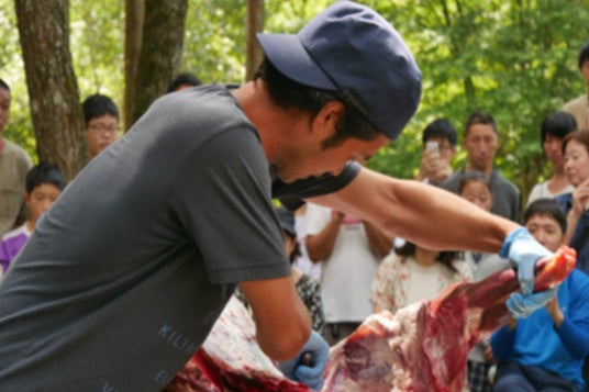 【鹿の解体ショー 現役猟師・青柳雄大による実演(13:00~)】 丹波山村の現役猟師・青柳雄大氏が、鹿一頭を丸ごと解体する実演を開催。単なる解体にとどまらず、罠にかかった部位ごとの肉質の違いや、各部位の特徴などを丁寧に解説します。