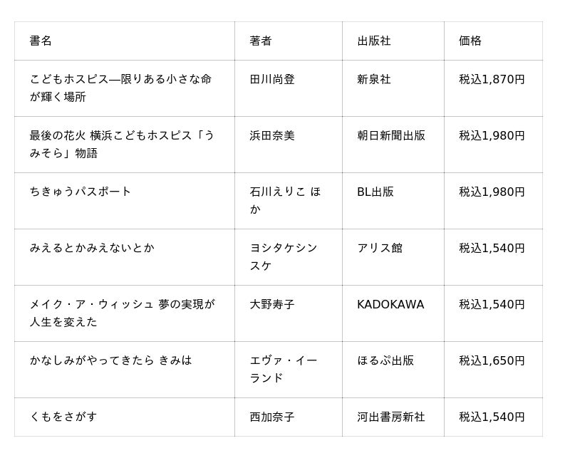 関連書籍フェアでは、「こどもホスピスとはなにか」「病気を抱えたこどもと支援」「命を輝かせる」「相互理解と共生」をテーマに、約40点の書籍を展開します。こどもホスピスそのものや、こどもホスピスが大切にしている考え方を、幅広い読者の皆さまに知っていただける内容です。▼展開書籍