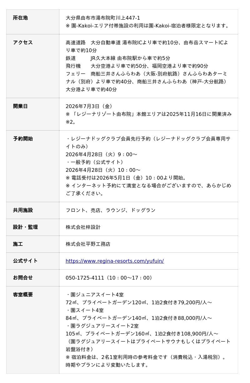 東京建物株式会社)と東京建物リゾート株式会社は、昨年2025年11月16日に開業した、愛犬同伴型ラグジュアリーリゾートホテル「レジーナリゾート由布院」において、プレミアムゾーン「圍-Kakoi-」(読み:かこい)が2026年7月3日に開業することをお知らせします。また、開業に先立ち4月28日10:00から公式サイトで宿泊予約受付を開始します。