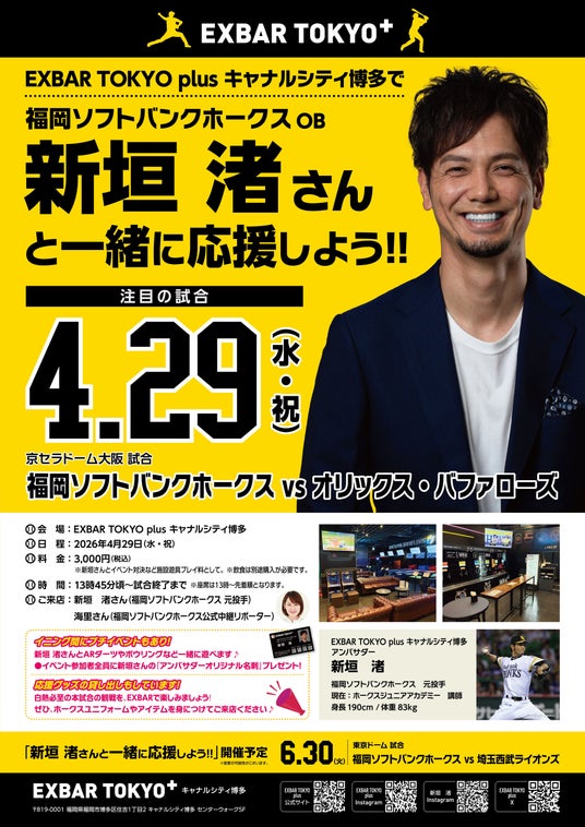 株式会社タイトー(本社:東京都新宿区、以下タイトー)が運営する福岡県福岡市のキャナルシティ所在のクラフトビール&ゲームバー「EXBAR TOKYO plus 博多」では、2026年4月29日(水・祝)にイベント「福岡ソフトバンクホークスOB新垣渚さんと一緒に応援しよう!」を開催いたします。