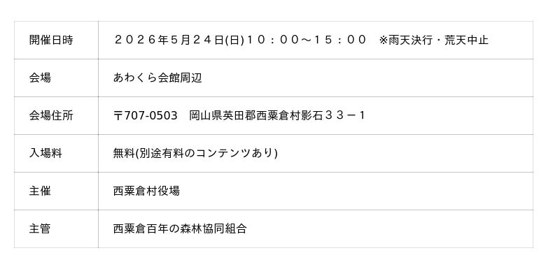 百年の森林まつり・2026  主催:西粟倉村役場 主管:西粟倉百年の森林協同組合