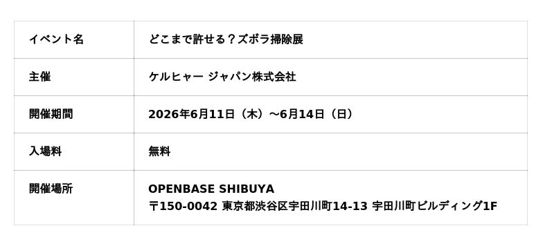清掃機器の世界最大手メーカー、ドイツ・ケルヒャー社の日本法人、ケルヒャー ジャパン株式会社(本社:神奈川県横浜市、代表取締役社長:挽野 元)は、“効率掃除”を叶えるハンディスチーマー「SC 1 Multi」シリーズのブランドコミュニケーションとして、『どこまで許せる?ズボラ掃除展』を2026年6月11日(木)から6月14日(日)までOPENBASE SHIBUYA(東京都渋谷区)にて開催いたします。