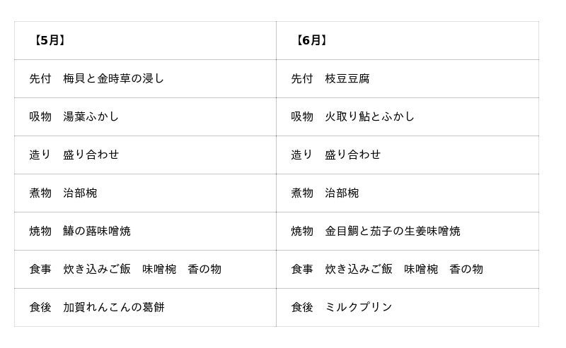 6月は紫陽花に見立て、彩り豊かに盛り付けたお造りや、生姜を効かせた味噌で香りよく仕上げた金沢港水揚げの金目鯛の焼物をご用意いたします。(一部献立の内容に変更がある場合がございます。)