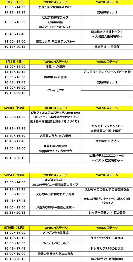 メイン会場は「TOFROM STAGE」「YAESU STAGE」2つのステージ。約200席の会場で、1日5~6ステージの公演を開催いたします。