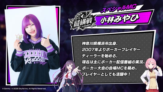 ポーカープレイヤーとしての実績に加え、数々のイベントでMCを務めてきた小林みやひさんが、スペシャルMCとして登場します。プレイヤー視点を交えたトークで、ゲーム展開を一層引き立てます。