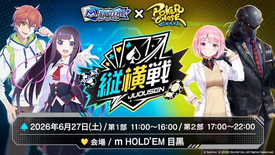 株式会社Skyfall(本社:東京都港区、代表取締役社長:長谷川 智一、以下Skyfall)が運営するバトロワ式テキサスホールデムポーカーゲーム『ポーカーチェイス』は、サミー株式会社(本社:東京都品川区 代表取締役 社長執行役員COO:星野 歩)が運営する「m HOLD'EM(エムホールデム)」(以下、m HOLD'EM)と共催するオフラインイベント「ポーカーゲームタイトル対抗 縦横戦(JUOUSEN)2026 春」を2026年6月27日(土)に開催することをお知らせします。