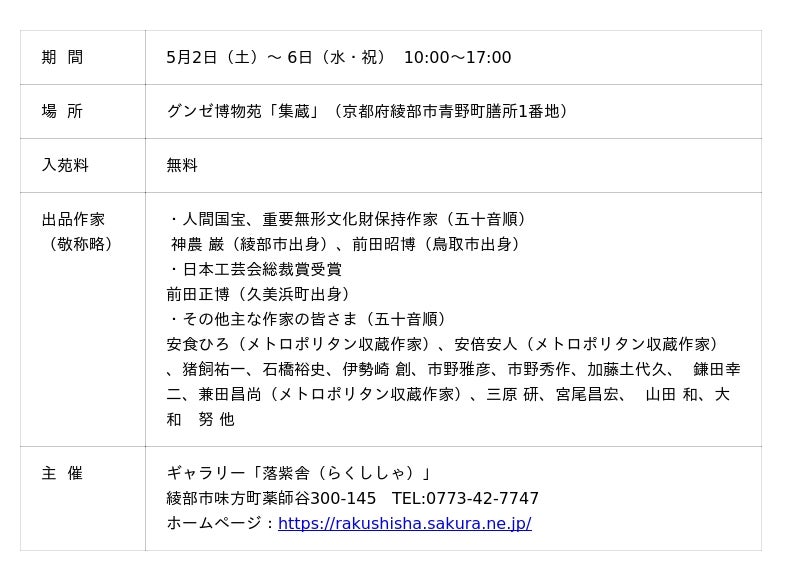 その30周年を記念して、5月2日(土)から6日(水・祝)まで、地元綾部市出身の人間国宝(重要無形文化財保持者)神農巌さん、同じく人間国宝の前田昭博さん(鳥取市出身)、「ニューヨーク・メトロポリタン美術館収蔵作家」安食ひろさん、日本伝統工芸展で最高賞の日本工芸会総裁賞を受賞した前田正博さん(久美浜町出身)など、陶磁器作家の名品約65点を展示します。