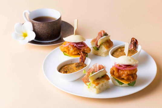 写真左から反時計回りに)海老のプランチャ ハーブマヨネーズ、ブリーとモルタデッラのチャバタサンド、クリスピーチキンのバオサンド ホットハニーソース