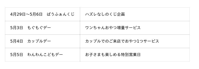 5月3日の「もぐもぐデー」では、ワンちゃんと遊べるおやつ増量サービスを実施。5月4日の「カップルデー」では、カップルで来店の方におやつを1つプレゼントサービスを行います。